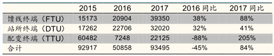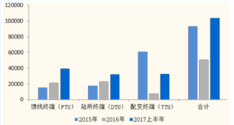 配電終端在2016年及以前采取的年初集中招標(biāo),之后采用按照項(xiàng)目分別招標(biāo)的模式。2017年上半年的配電終端招標(biāo)總數(shù)為103,570套,相比于2016年全年的50,858套,同比增長(zhǎng)103%,也超過了2015年全年招標(biāo)量。2017年10月將舉行第二次招標(biāo),根據(jù)國(guó)網(wǎng)公司2017年度招標(biāo)計(jì)劃安排,預(yù)計(jì)2017年饋線終端(FTU)和站所終端(DTU)的招標(biāo)量比前兩年實(shí)現(xiàn)翻倍增長(zhǎng)幾乎已成定局。