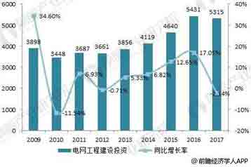 近年來,隨著中國經(jīng)濟的較快發(fā)展,東南沿海地區(qū)普遍出現(xiàn)了缺電的現(xiàn)象,中國電力發(fā)展長期存在的“重發(fā)輕送”問題逐漸暴露出來,其凸顯出的是中國電力行業(yè)發(fā)展中的一個薄弱環(huán)節(jié)——電網(wǎng)設(shè)施相對不足。2006年后,電網(wǎng)建設(shè)超過電源建設(shè)發(fā)展,成為電力建設(shè)的主要投資重點。電網(wǎng)投資比例持續(xù)上升,投資比例結(jié)構(gòu)趨于合理,改善了近幾年中國電源投資規(guī)模過大、增速過快、比例過高的趨勢,電源與電網(wǎng)開始協(xié)調(diào)、科學(xué)發(fā)展。目前,特高壓、配電網(wǎng)及其新一輪農(nóng)網(wǎng)升級改造工程全面啟動,帶動電網(wǎng)投資大幅增長。2017年,電網(wǎng)工程建設(shè)完成投資5315億元,同比下降2.14%。
