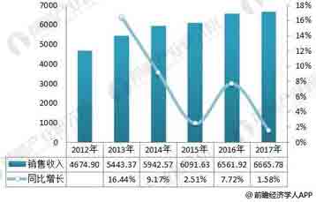 根據(jù)前瞻產(chǎn)業(yè)研究院《2018-2023年中國配電開關(guān)控制設(shè)備制造行業(yè)產(chǎn)銷需求與投資預(yù)測分析報告》數(shù)據(jù),2017年我國配電開關(guān)控制設(shè)備行業(yè)實現(xiàn)銷售收入6665.78億元,同比增長1.58%。前瞻認(rèn)為未來我國電力建設(shè)投資規(guī)模高企,配電開關(guān)控制設(shè)備制造行業(yè)廣闊的市場空間將繼續(xù)維持,有望繼續(xù)低速增長。