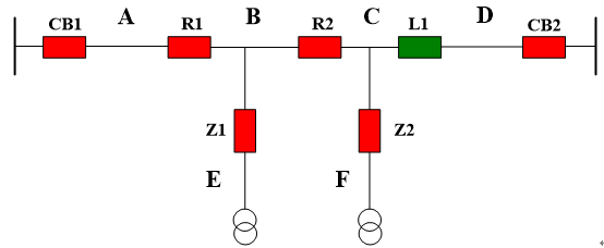 當(dāng)支線F區(qū)域(或E區(qū))發(fā)生故障時(shí),根據(jù)保護(hù)延時(shí)時(shí)間配合,F(xiàn)區(qū)域的分界斷路器Z2在25ms內(nèi)保護(hù)跳閘,上級(jí)斷路器CB1,R1,R2不動(dòng)作,不影響其他支線和主干線路供電。
